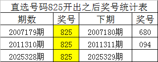 从上表统计不错看出,直选号码825开出之后,其下期奖号: